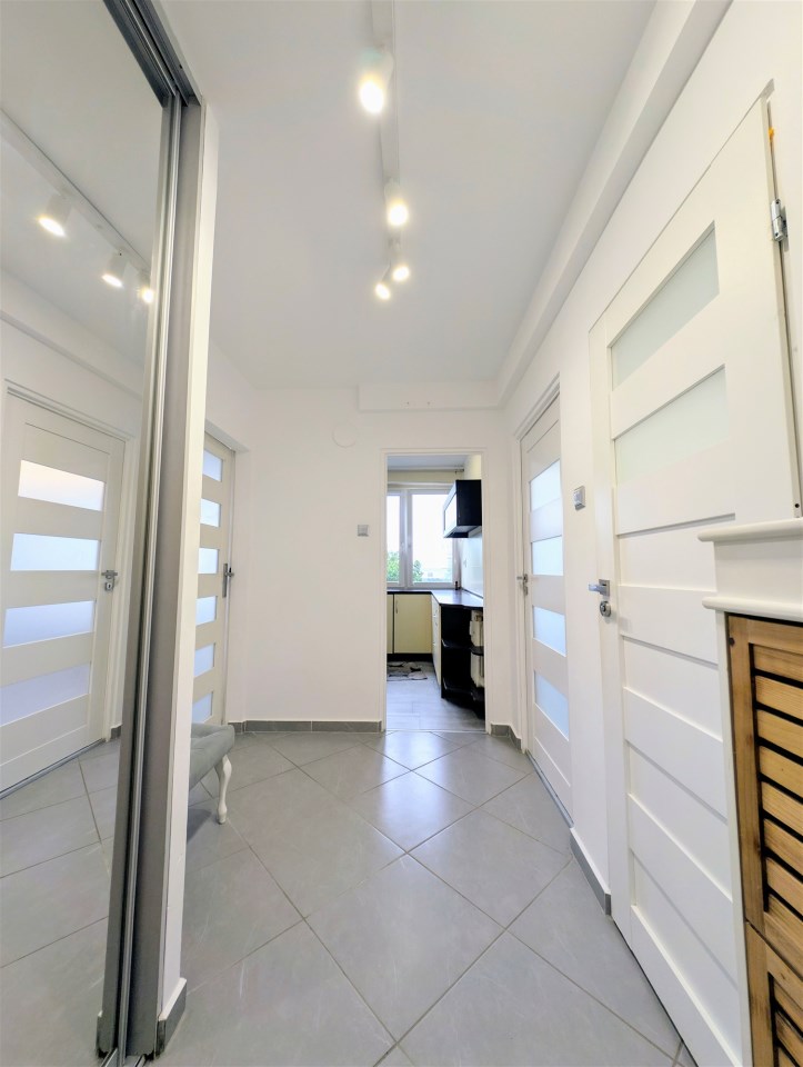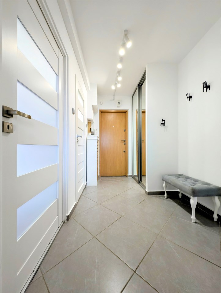 - Przestronny korytarz – wyposażony w zabudowaną szafę, zapewniającą miejsce na przechowywanie.