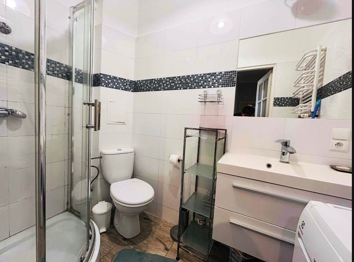 Wyposażenie łazienki | umywalka na szafce, WC, lustro, pralka, umywalka, kabina prysznicowa |