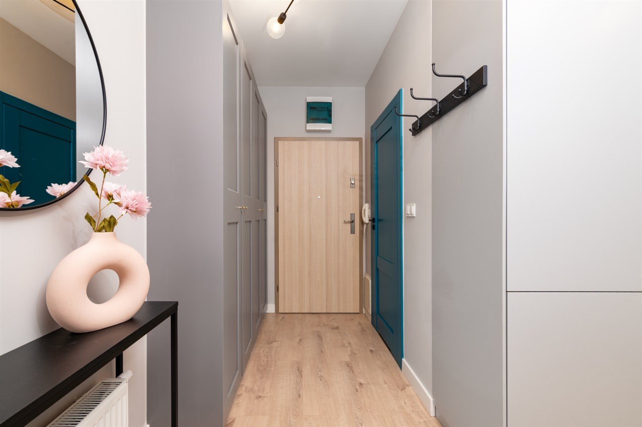 Wnętrze jest w pełni umeblowane i wyposażone w niezbędne sprzęty AGD i RTV, takie jak zmywarka, lodówka, piekarnik, płyta grzewcza, pochłaniacz, pralka oraz telewizor. Dzięki temu nowy właściciel może wprowadzić się od razu, zabierając jedynie osobiste rzeczy. Mieszkanie może również stanowić atrakcyjną opcję inwestycyjną, gotową do wynajmu bez dodatkowych nakładów.