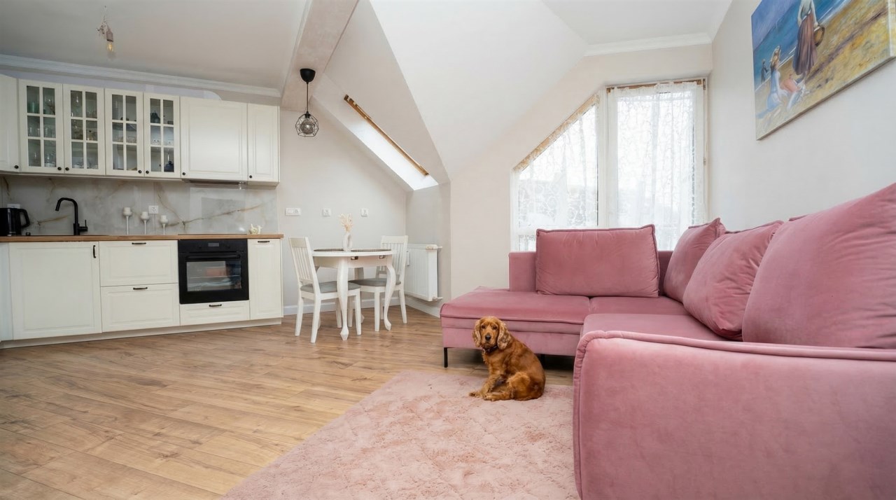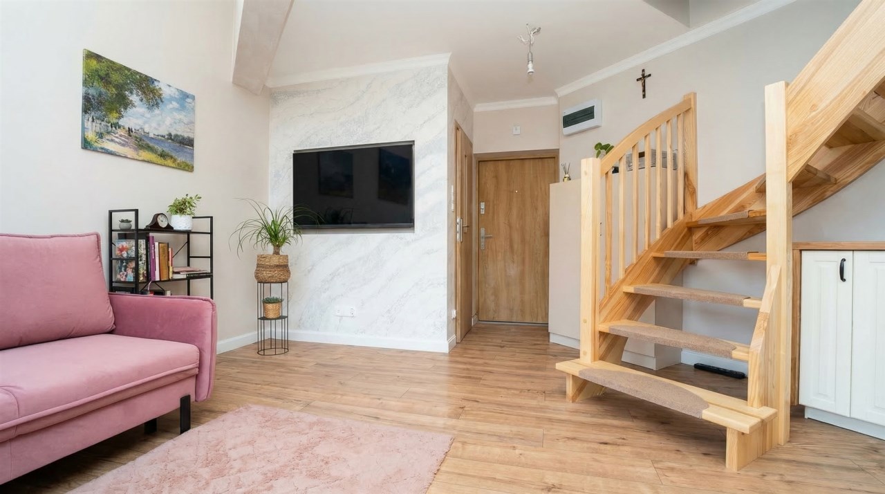 Mieszkanie w 2025 roku przeszło generalny remont, łącznie z wymianą instalacji. Na obu poziomach na podłogach nowe wysokogatunkowe panele. Kuchnia w nowoczesnej zabudowie pod wymiar wraz z nowym sprzętem AGD (zmywarka, indukcja, piekarnik). Z salonu wyjście na spory balkon z ładnym widokiem. Zostały również zrobione nowe drewniane, szerokie schody. Na II poziomie stałe zabudowy, obecnie podzielony jest na część wypoczynkową oraz strefę sypialnianą.