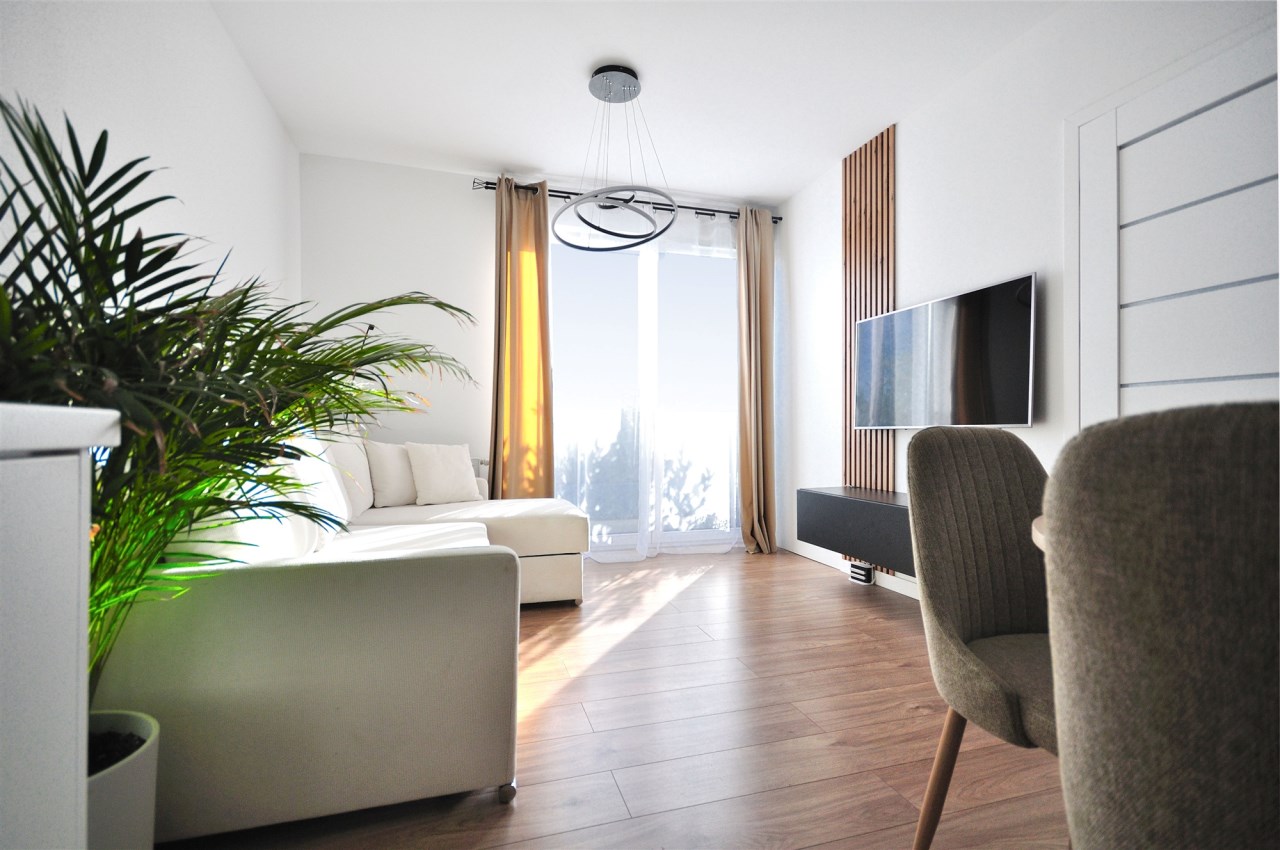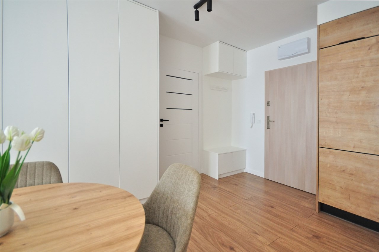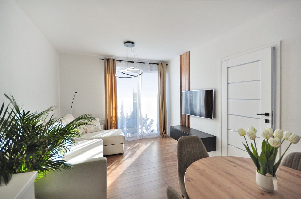 Salon dzienny z aneksem kuchennym, sypialnia osobno. Z obu pokoi wyjście na balkon.