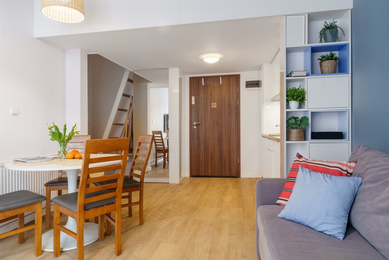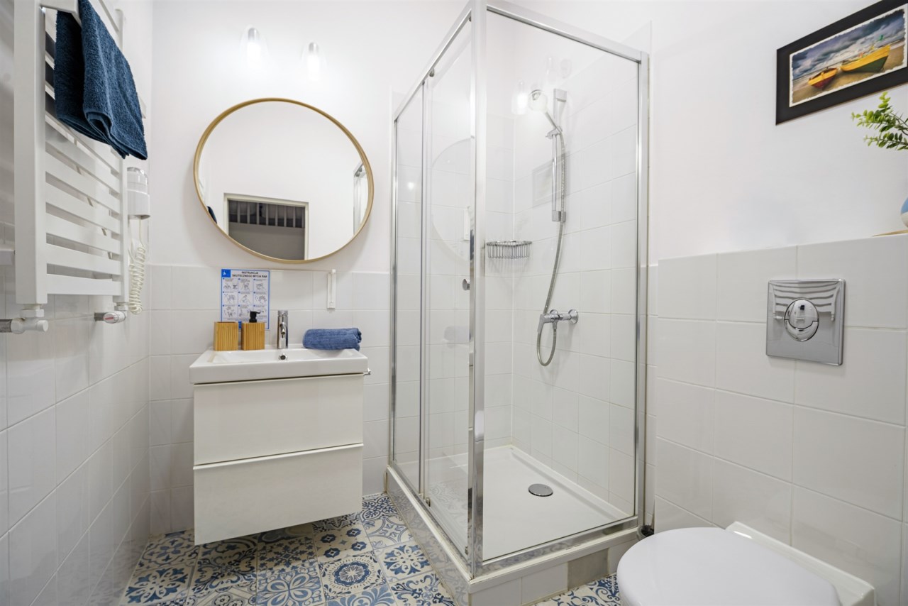 Funkcjonalne studio z antresolą zostało zaprojektowane z myślą o maksymalnym komforcie gości. Na antresoli znajduje się dwuosobowe łóżko oraz telewizor, natomiast w części dziennej – rozkładana sofa, stół z krzesłami oraz drugi telewizor. Lokal pomieści 4 osoby, co znacząco zwiększa jego potencjał najmu. Do dyspozycji jest również w pełni wyposażony aneks kuchenny (lodówka, płyta kuchenna, pochłaniacz i kuchenka mikrofalowa). Całość uzupełnia balkon z bocznym widokiem na morze.