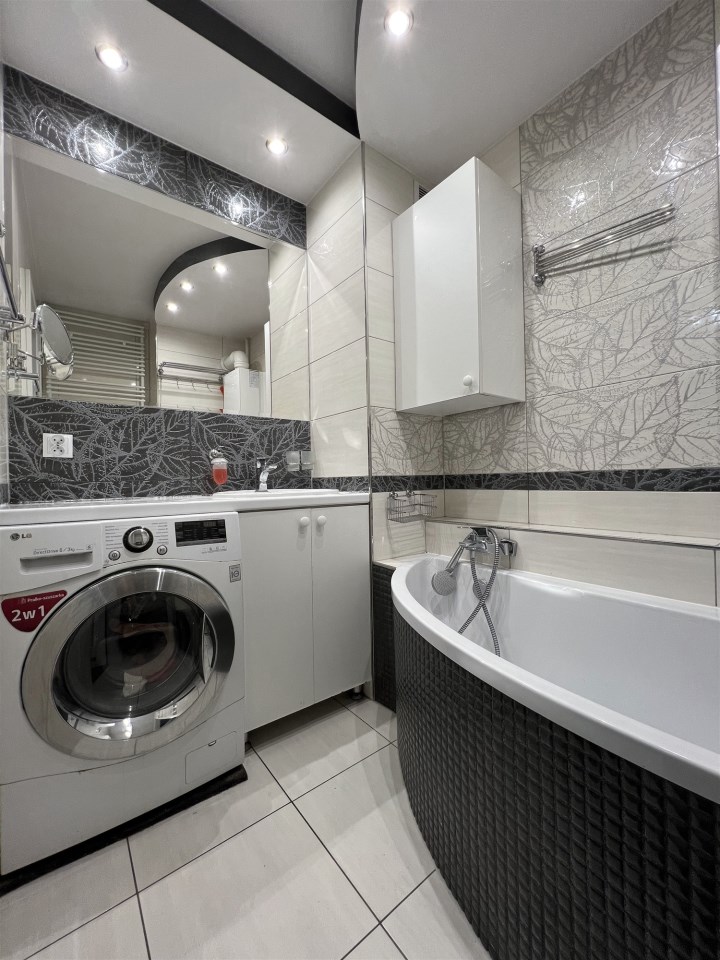 | Wyposażenie łazienki | WC, wanna zabudowana, wanna narożna, umywalka na szafce, pralka, lustro |