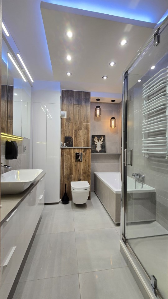 - łazienki wyposażonej w kabinę prysznicową, wannę, wc, umywalkę