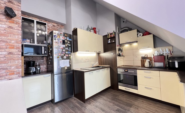 Mieszkanie dwupoziomowe w domku wolnostojącym dwurodzinnym w Dąbiu bezczynszowe w okolicy plaży miejskiej. Mieszkanie znajduje się na pierwszym piętrze i poddaszu ; na niższym poziomie znajduja się trzy pokoje , kuchnia z jadalnią zabudowaną meblami na wymiar i wyposażoną , łazienka razem z wc . Poddasze zaadaptowane i wykończone - jeden duży otwarty salon z barem wyposażonym w media oraz łazienka razem z wc. Do części domu należy 300m2 ogrodu na którym stoją dwa garaże ; 70m2 murowany na dwa samochody i blaszany na jeden samochód . Do nieruchomości przynależy część podpiwniczenia w którym znajduje się piec gazowy . . Dom ocieplony w dobrym stanie technicznym , dachówka ceramiczna . Bardzo ciche i spokojne miejsce Dąbia Istnieje możliwość zakupu dodatkowo ok. 600m2 gruntu.