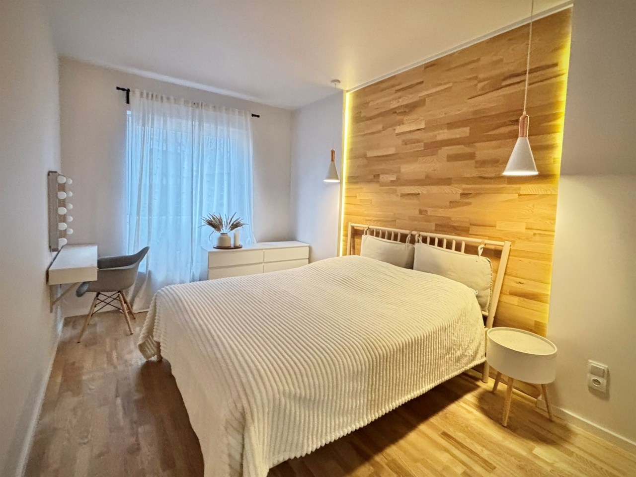 Sypialnia z łóżkiem o szerokości 160 cm, toaletką z lustrem i szafkami do przechowywania. Ma okno od strony północnej. Na podłodze deska drewniana trójwarstwowa.