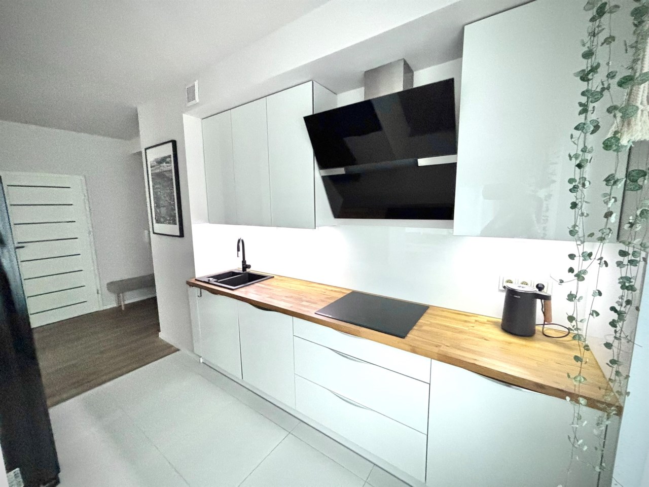 Kuchnia ma pełne wyposażeniem AGD (lodówka side by side, zmywarka, piekarnik, płyta indukcyjna i okap. Na podłogach deska drewniana trójwarstwowa, w kuchni płytki.