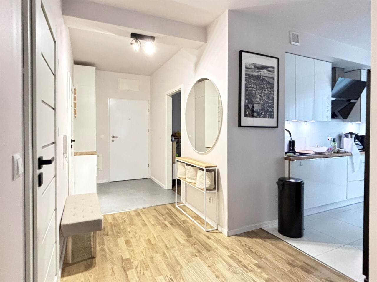 Korytarz wyposażony w wysoką szafę oraz szafkę na buty. Znalazło się tu także wygodne siedzisko oraz konsola z dekoracyjnym lustrem.