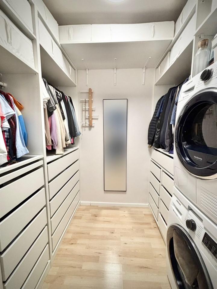 Garderoba z pralką i automatyczną suszarką oraz świetnie zaaranżowaną przestrzenią.