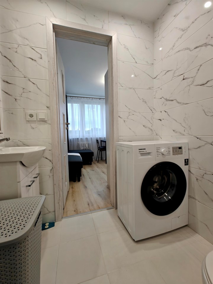 | Wyposażenie łazienki | kabina prysznicowa, pralka, umywalka na szafce, WC |
