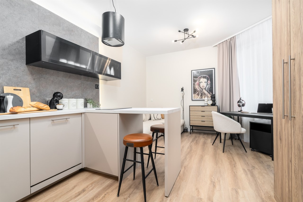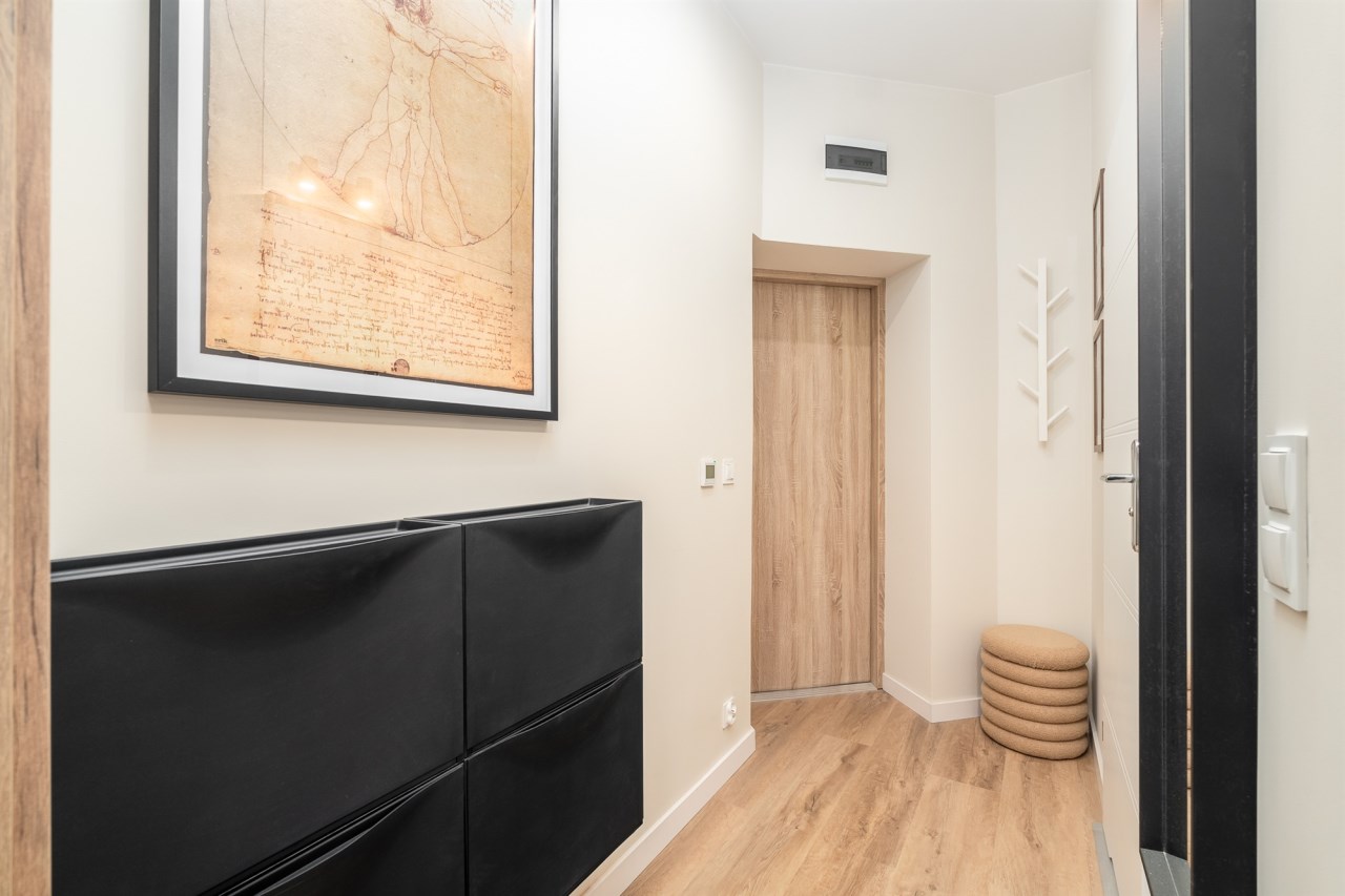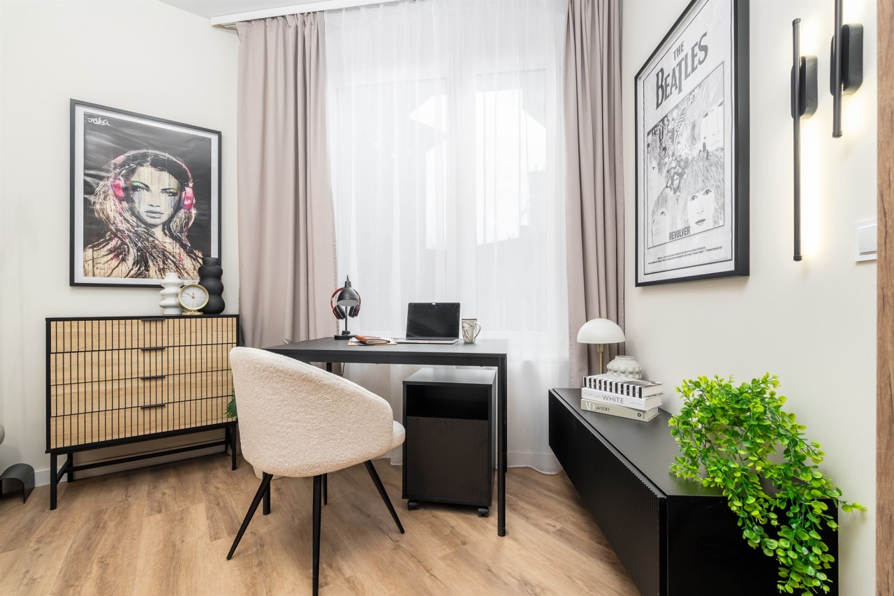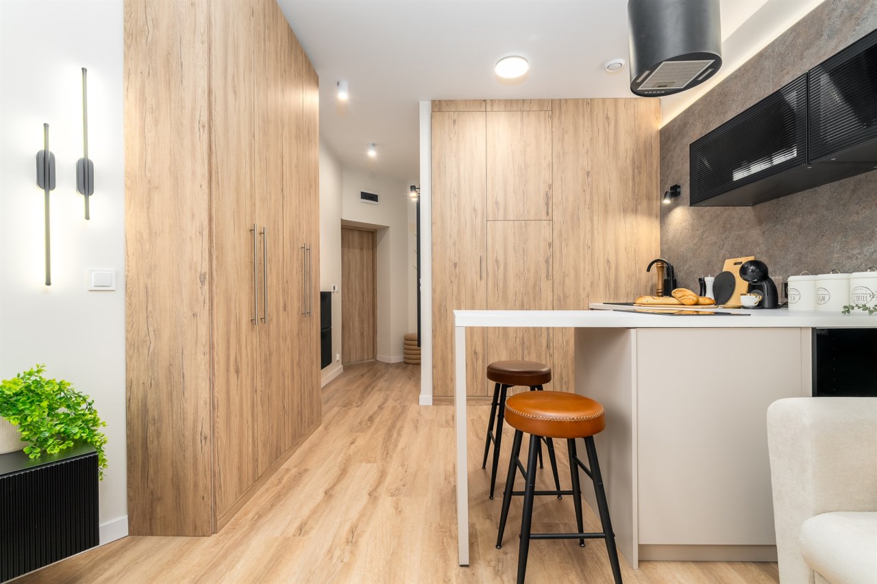 Mieszkanie po remoncie kapitalnym, o południowej ekspozycji okien. Pokój dzienny z aneksem kuchennym, łazienka i korytarz. W pokoju i korytarzu na podłodze panele, ściany wygładzone, malowane. W pokoju wypoczynek, stolik kawowy, biurko, krzesło, komoda, stolik RTV, duża szafa ubraniowa i szafka na buty. Łazienka w glazurze i terakocie, kabina prysznicowa, muszla podwieszana typu geberit, umywalka, meble łazienkowe, lustro, pralka. Kuchnia kompletnie umeblowana i wyposażona: barek, dwa stołki barowe, duża lodówka z zamrażalnikiem, lodówka, płyta elektryczna, okap, zmywarka, mikrofala.
