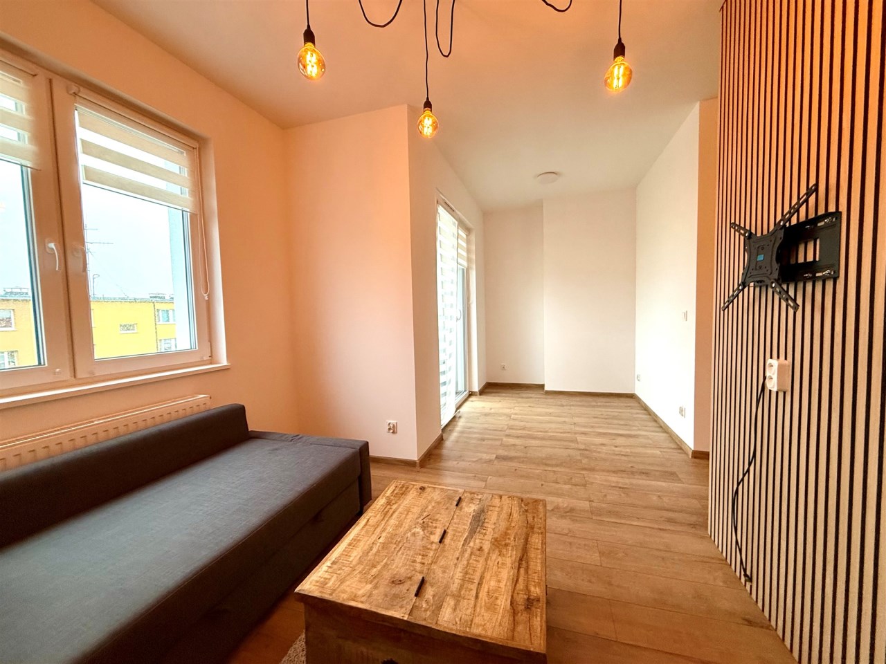 Do wynajęcia jasna, nigdy wcześniej niezamieszkana kawalerka o powierzchni ok. 30 m², z wydzielonym miejscem na aneks sypialniany.