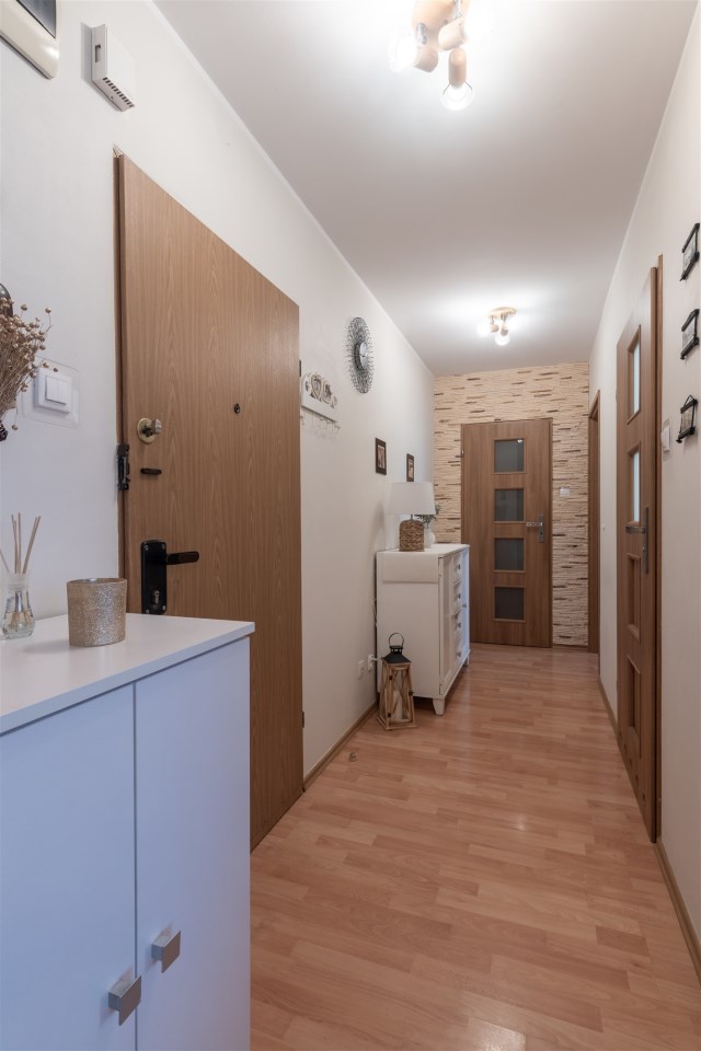 Mieszkanie położone na trzecim piętrze budynku, o północno zachodniej ekspozycji okien. Z balkonu rozpościera się piękny widok na zachodnią część miasta. Mieszkanie w bardzo dobrym standardzie, na podłodze panele, ściany gładzone, malowane. W łazience, z wanną i wc, ładna, jasna glazura i terakota. Pokoje w całości umeblowane i wyposażone. Kuchnia umeblowana i wyposażona w sprzęt AGD - płyta elektryczna, piekarnik elektryczny, lodówka, okap, kuchenka mikrofalowa. W łazience znajduje się pralka. Dodatkowo w mieszkaniu znajduje się duża garderoba. Ogrzewanie i ciepła woda z SEC - osobna umowa.