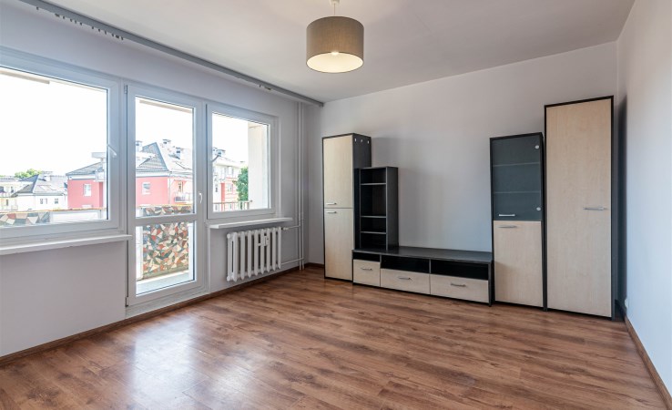 Pokój dzienny z balkonem, w holu szafa, sypialnia od strony południowej.