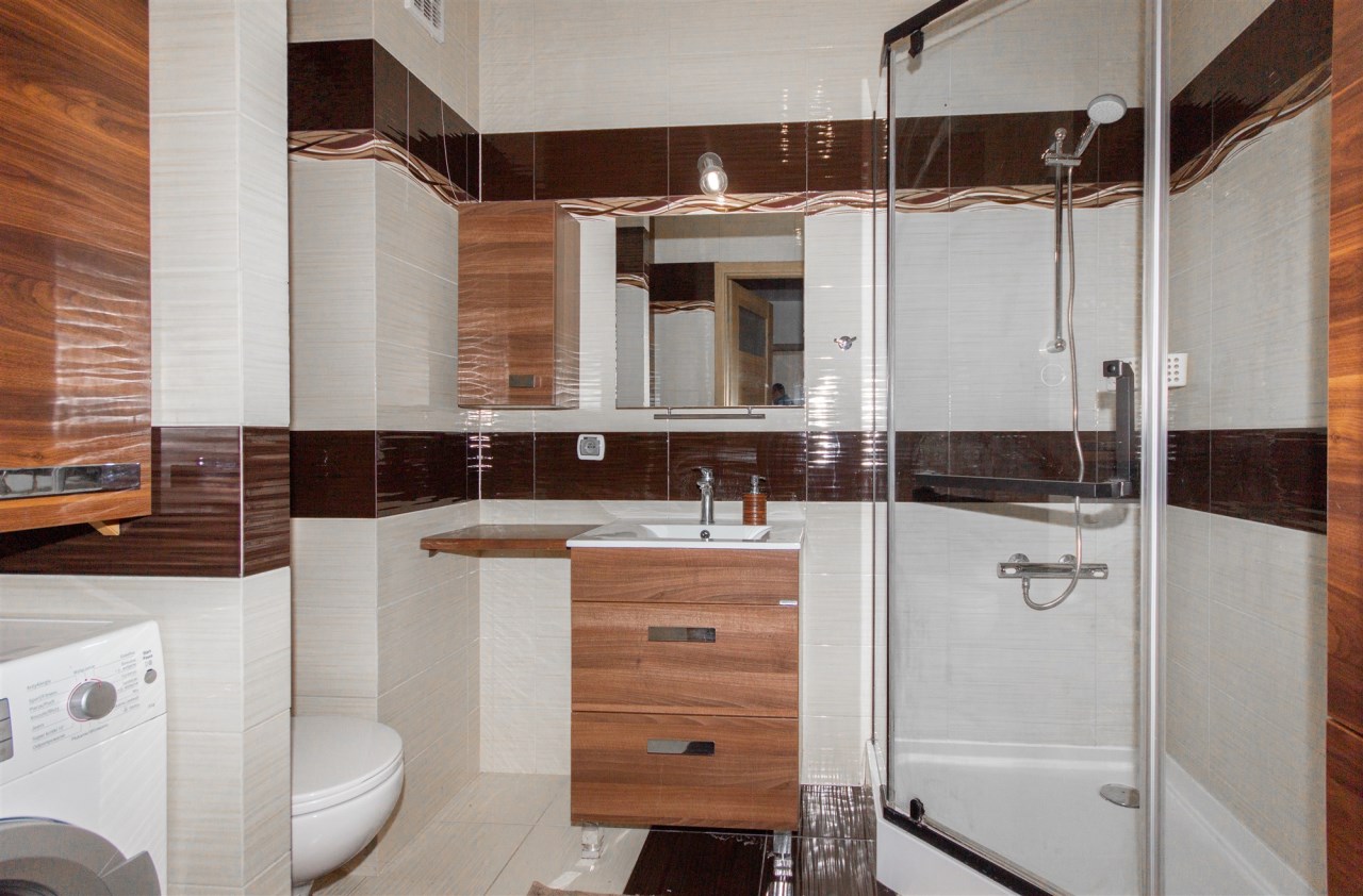- łazienka z kabiną prysznicową i pralką,